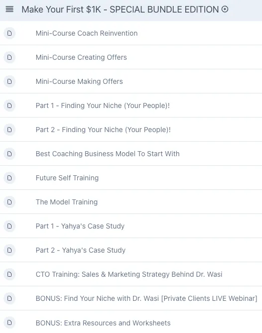 All lessons that will teach you how to reinvent yourself as a coach, find a niche you want to impact, create an offer that sells, and pitch that offer to the people you will be serving...