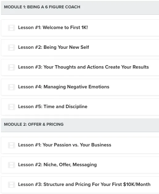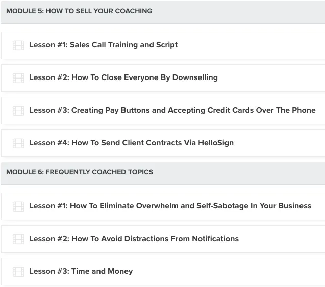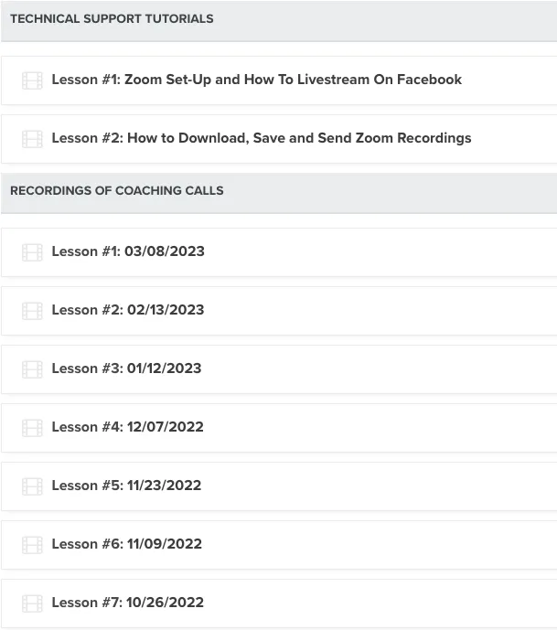 8 comprehensive modules, 34+ step-by-step lessons, and 85+ live recordings of coaching calls.